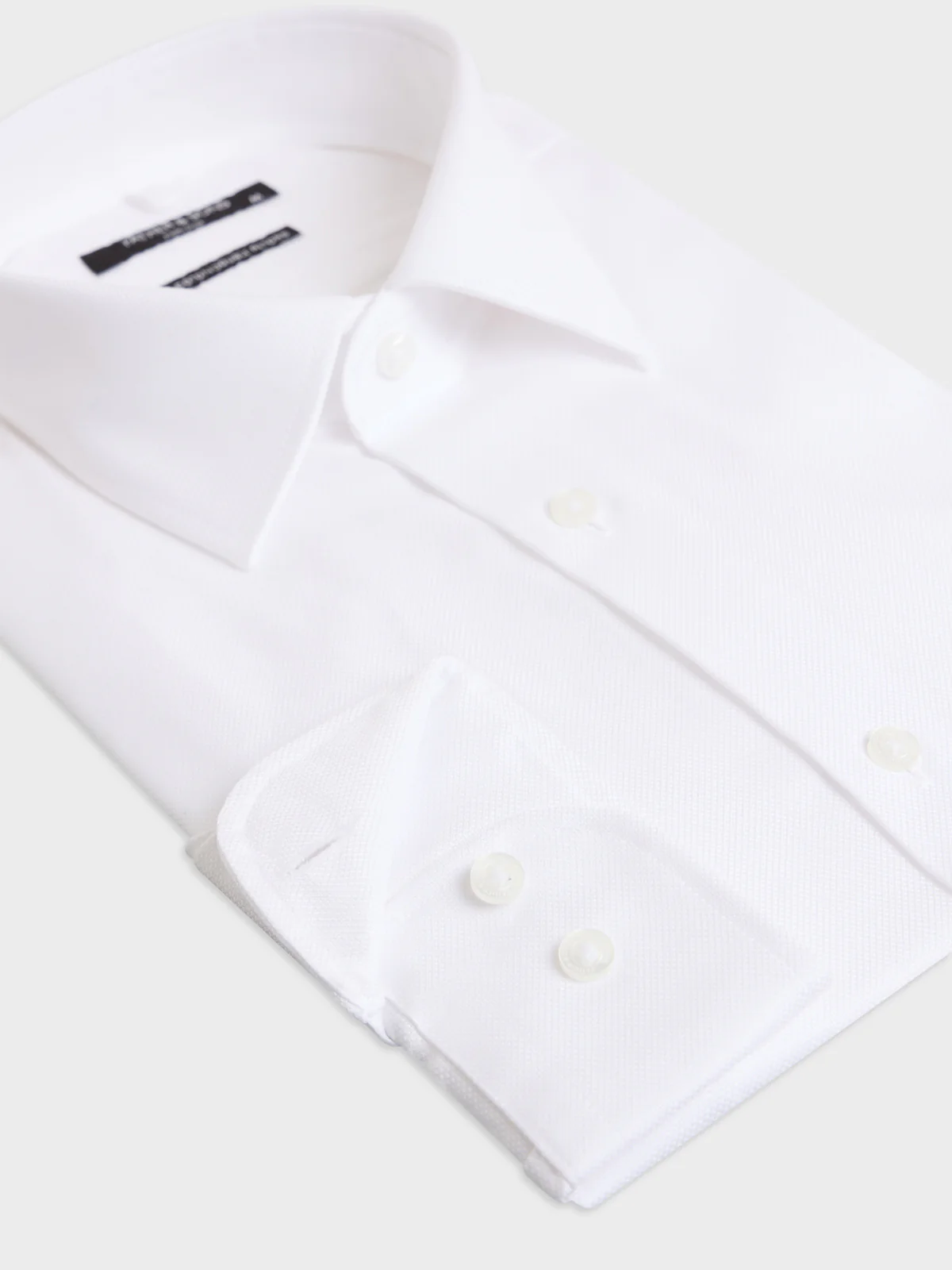 Chemise slim en coton façonné blanc, un classique revisité avec élégance. Son tissu texturé apporte du caractère et une touche de modernité à la chemise blanche traditionnelle. La coupe ajustée souligne la silhouette avec justesse. Sa finition non-iron garantit une tenue nette et sans pli du matin au soir.